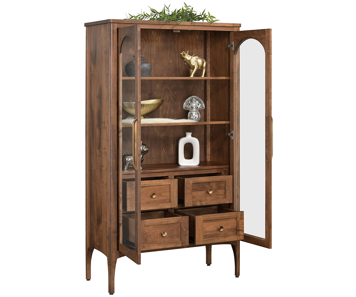 Features: • LED touch lights • Two adjustable glass shelves • Glass shelves have a wood frame • Dovetailed drawers • Full extension drawer slides