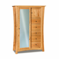 Features: • Beveled mirror • 1″ Solid wood top • Concave curved sides • Dovetailed drawer boxes • Full extension drawers slides • Three adjustable shelves • One adjustable clothing rod